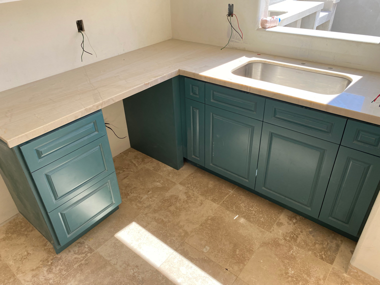 All of the indoor floors are done with square travertine tiles. The showers are travertine tiles with insets for shampoo, soap other items. The bathroom vanities are covered with travertine slabs. The stair insets are handmade talavera tiles, which took forever to make the choice of the combination of tiles given the incredible selection at Terrazul (we ordered custom lot number plaques from Terrazul too). All of the outdoor spaces and the stair steps are Cafe 2 cantera stone from central Mexico and provided by DiCantera – Disenos en Cantera. Our indoor and outdoor kitchen counter tops are quartzite, upgraded from granite. We learned in the process that quartz is manmade and cannot be used outside in the heat as it will start to get wavy and uneven, while quartzite is a natural stone. We choose one quartzite for our kitchen and free-standing island countertops and another for our outdoor kitchen. We had Cabo Stone cut the sink cut out into a square to use as a chopping block, as it cannot be damaged. All of the countertops in the kitchen and bathrooms were supplied by Cabo Stone.