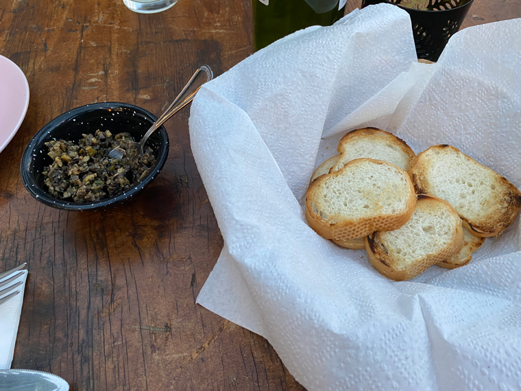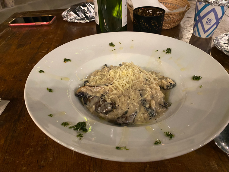 We ordered our drinks and were presented with a basket of grilled bread and a bowl of tapenade as an amuse compliments of Traspatio. It was delicious. We ordered the Caesar salad to start. The romaine lettuce was grilled, there was crunchy bacon (also prepared on the grill) and three pieces of garlic bread with a creamy traditional Caesar dressing. Amazing! Beth ordered the Baby Back Ribs with grilled pineapple and the roasted potatoes as her side dish. I ordered both the Portobello Mushroom risotto and the Portobello Mushroom tacos (sticking with my current plant-based diet).