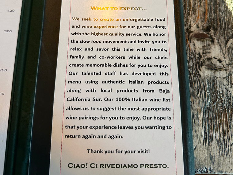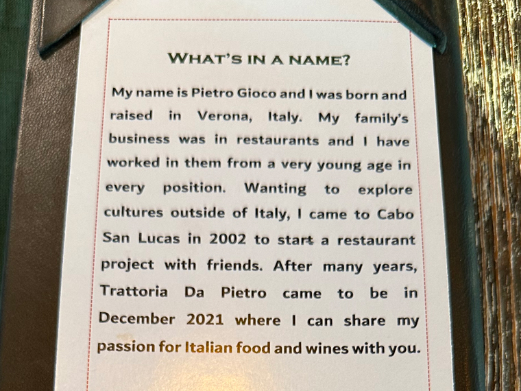 We arrived for our reservation and were greeted at the host stand by Pietro Gioco, the owner of the restaurant. Pietro comes from a family of restauranteurs in Italy and has been in the restaurant business from an early age. He arrived in Cabo San Lucas in 2002 and his former restaurant was DOC, across from the park on Calle Hidalgo in Cabo San Lucas.