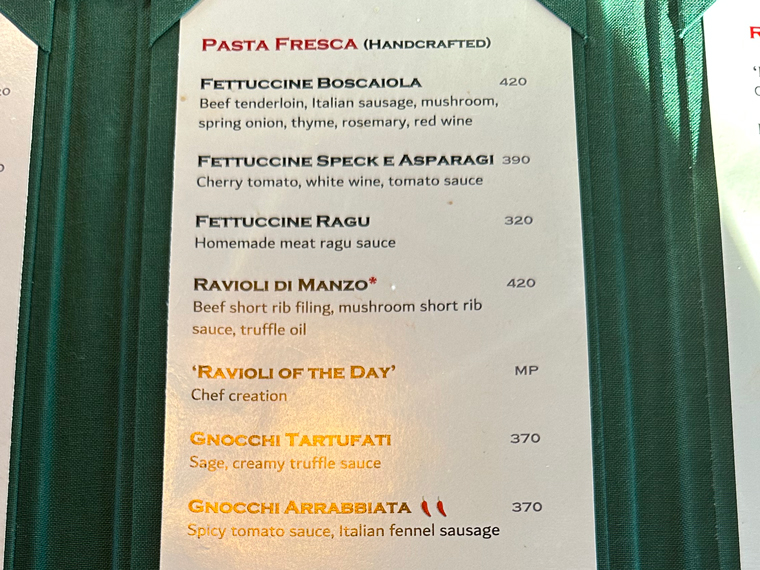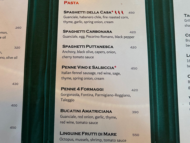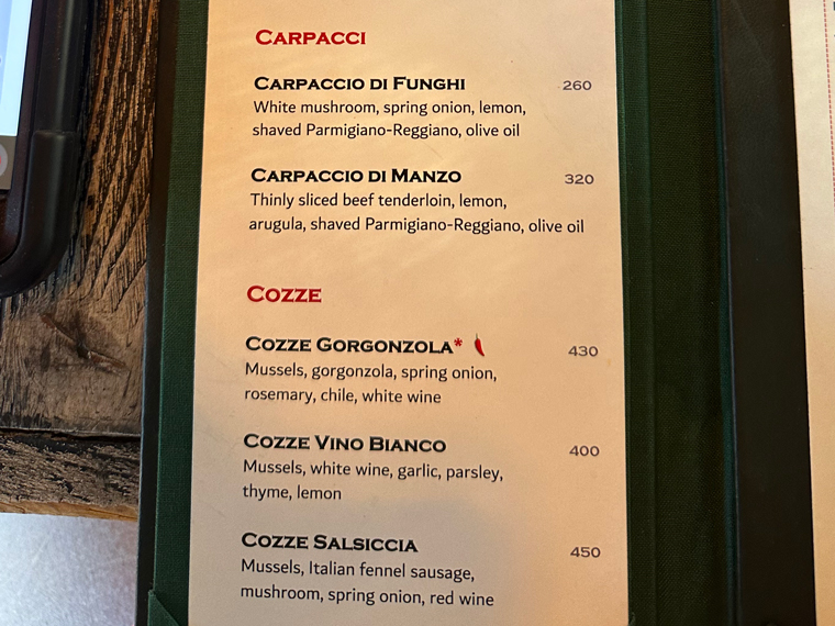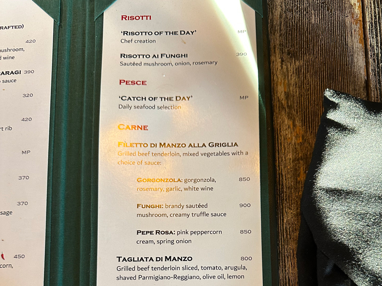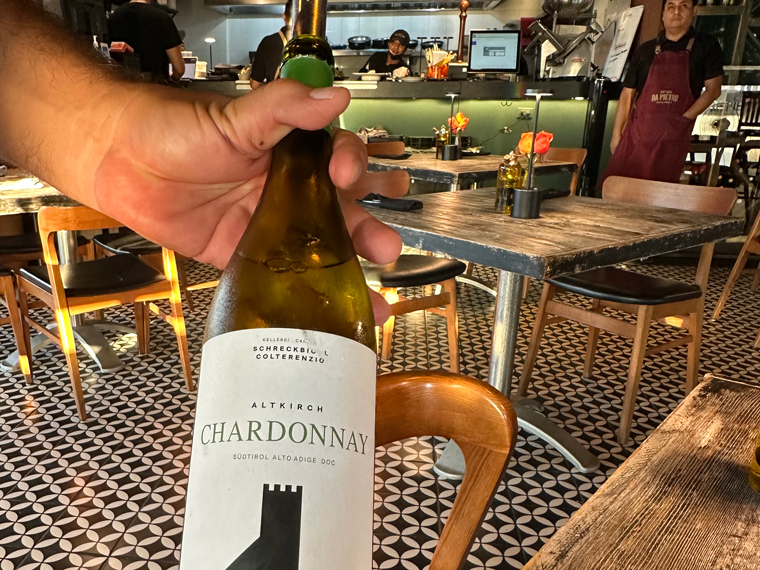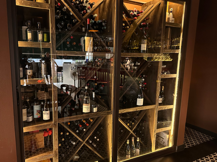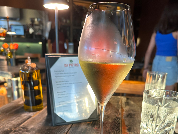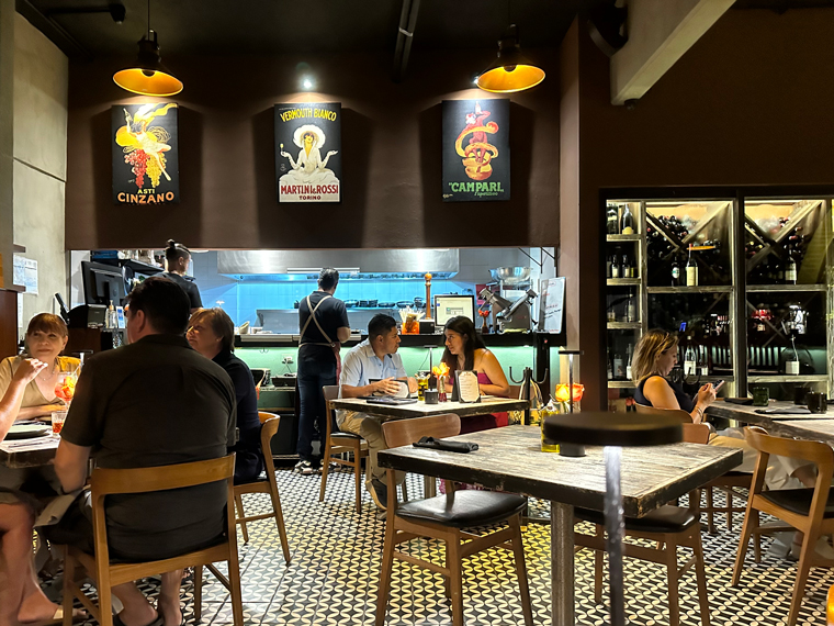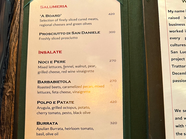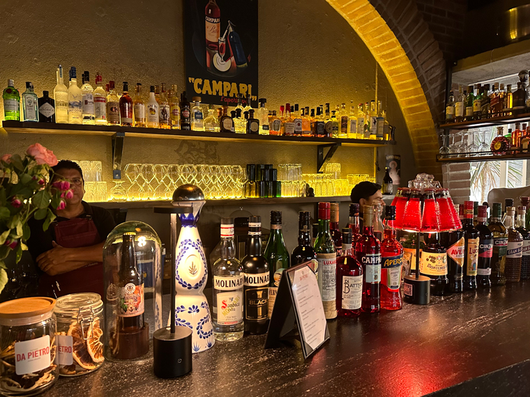 Trattoria Da Pietro has seating both inside (with air-conditioning and on a patio outside). We were led to a table for two and offered the menus. The design of the design of the interior of the restaurant is very pleasant with large posters of Campari, Asti Cinzano and Martini and Rossi on the walls. The unique wine cellar designed by Pietro displays only Italian wines. There is a large bar at the back of the restaurant, which includes a large selection of spirits with a good selection of Clase Azul Tequila.