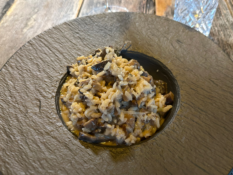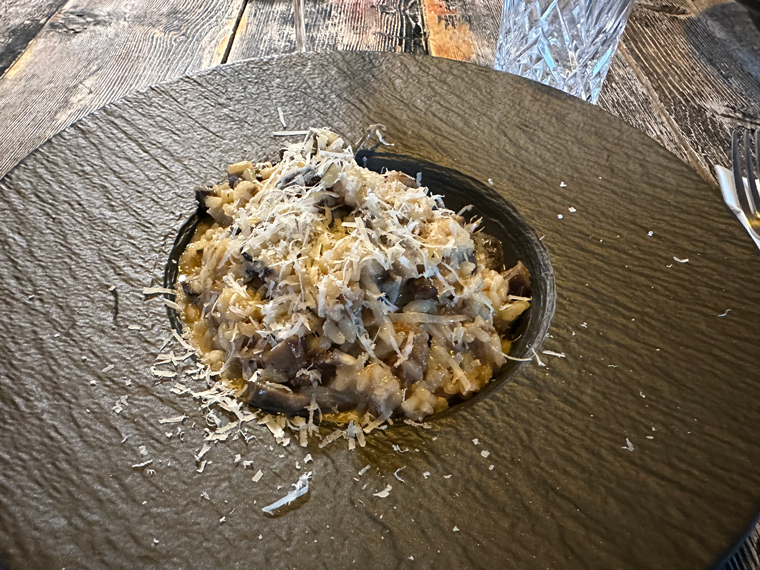 The menu provides an extensive selection of Italian dishes including appetizer boards, salads, carpaccio, cozze, fresh pastas, risotto, fish, chicken, beef, veal and more. There was both a special pasta and a special risotto that our server Roberto described to us. We were provided with a bowl of fresh bread with olive oil and balsamic vinegar and offered drinks. As usual, I order a glass of Chardonnay. Roberto brought the Altkirch Chardonnay for me to try. As an appetizer, Beth ordered the Burrata Salad with heirloom tomatoes and basil and I ordered the Carpaccio with large slices of fresh parmesan and argula on top. Both were excellent.