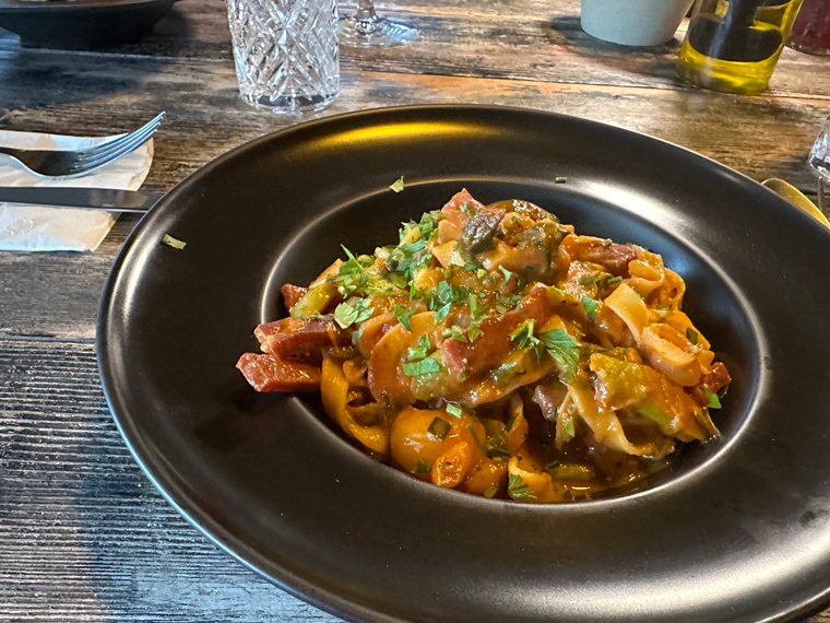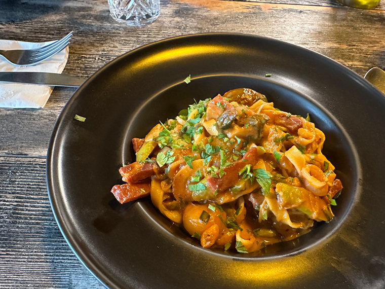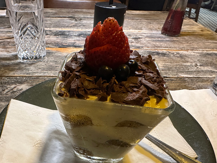 For a main course, I was having a hard time choosing between the Risotto of the day and the Mushroom Risotto on the menu. Roberto convinced me to try the Risotto of the day, which featured a selection of different types of mushrooms. Beth selected the Fettuccine Speck e Asparagi. She didn’t know what Speck was and it turned out to be proscuitto. The portion sizes were large and we ended up taking some of our entrées home with us for lunch the next day.