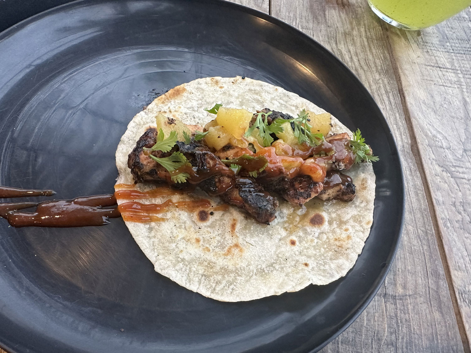 For our dinner, Beth went for shrimp – a shrimp empanada and the battered shrimp taco. I selected the tuna tostada and a BBQ chicken taco. Everything was clearly made at the restaurant. Beth was very impressed with her two shrimp dishes, saying they had great flavor. The tuna tostada amazed me. It was two square tostadas piled high with tuna, pineapple, avocado, and small seeds. It was delicious and a good-sized portion. The BBQ chicken was also very good with lots of chicken in a tasty BBQ sauce with fruit and tomato and greens to add to the flavor.