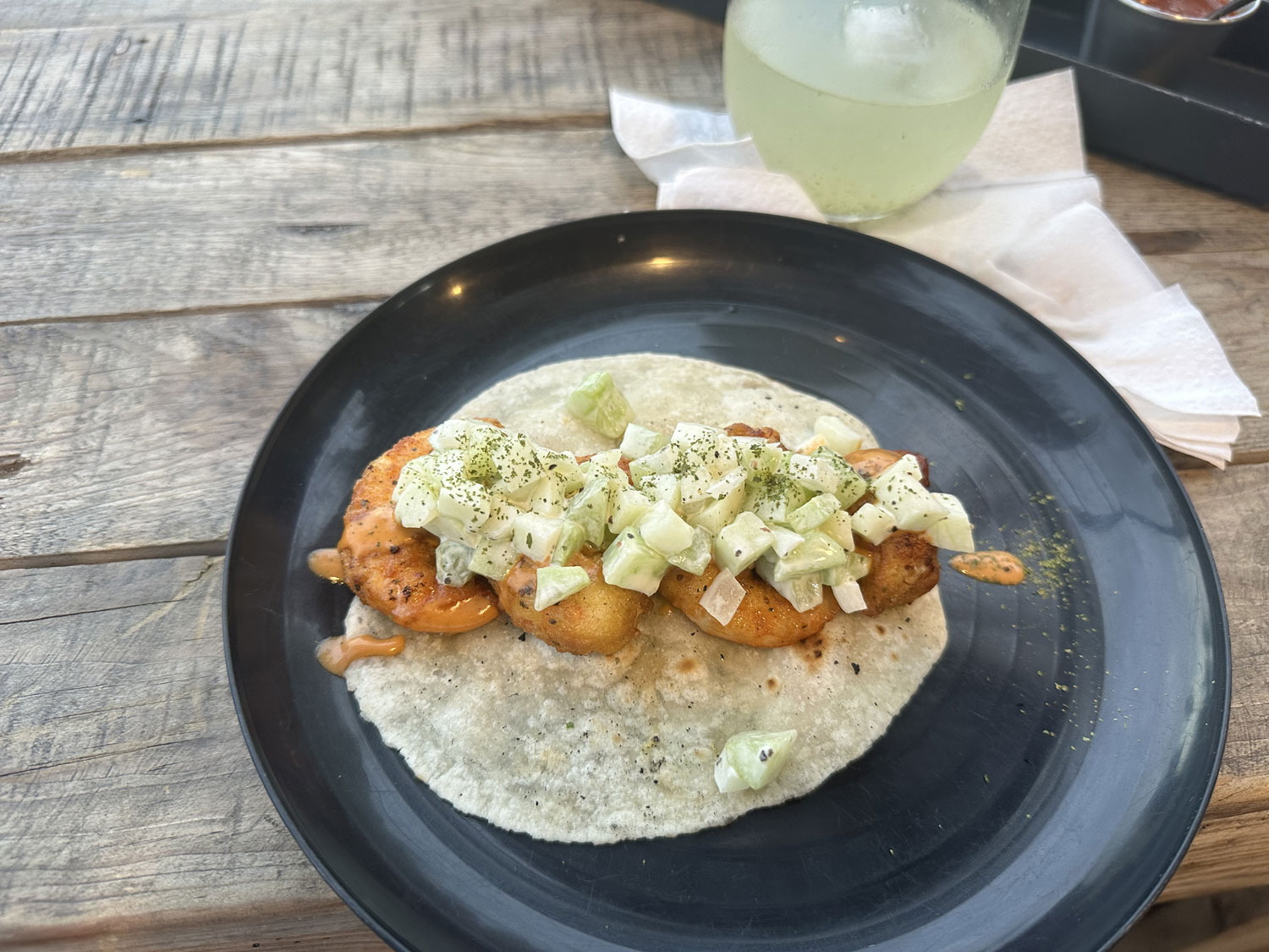 The menu is a simple checklist that includes appetizers, tostadas, empanadas, tacos and dessert. Similarly, the drink list is simple with several of the flavor waters being made and bottled by the restaurant. Omar, the owner asked us what we would like to drink. Beth ordered the limonada and I chose the cucumber water. Both were served in Tropico bottles and were very good.