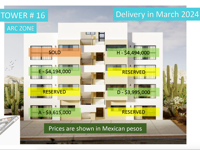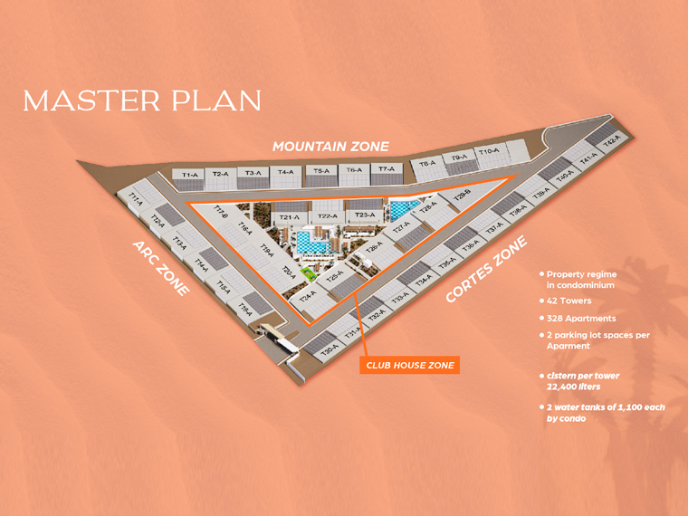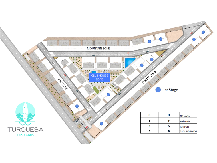 Turquesa is a triangular shaped development that will have 41 buildings with eight two-bedroom units in each – 328 total units upon completion. The buildings are considered in the Mountain, Lands End Arch, Sea of Cortez or Club House Zone of the development, based on the views that the condo has. There are two units on each of the four floors of each building. Each unit has two stacked parking spaces in front of the building and each side of the building has access to a special roof deck with amenities – guarantying that everyone can see great mountain, sea and arch views. The complex has two large pools – one for adults only – and palapa outdoor dining and play areas for families.
