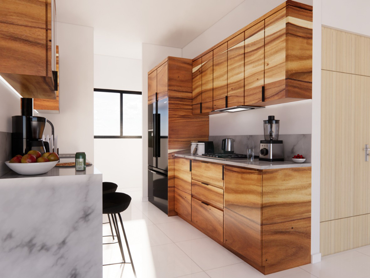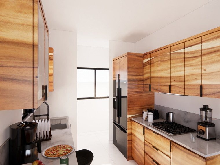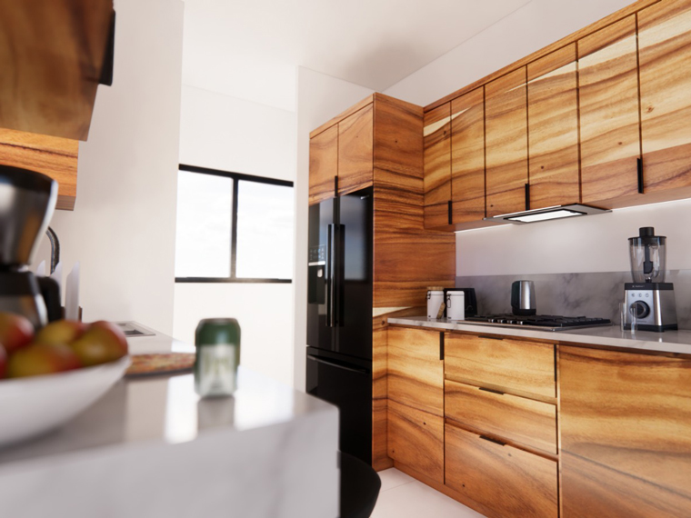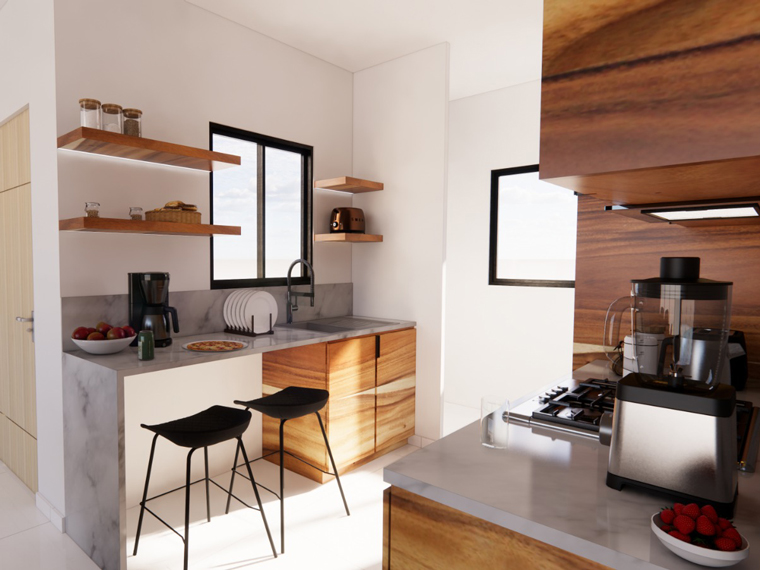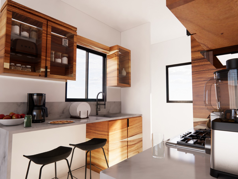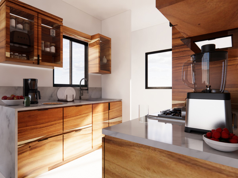 As a Mexican builder, Lafher like their counterparts on the mainland, do not completely finish the countertops and cabinetry in the kitchen and bedrooms. Rather, as with furniture, they have developed relationships with top local firms to offer alternatives to each buyer (at an additional cost depending on the buildout chosen). For the cabinetry, Lafher selected Carlos Ochoa and Carmat Carpinteria as one of their major suppliers. Carmat did a lot of work for us and our neighbors in Pueblo Campestre, ranging from wall units and islands to all types of furniture. The shop is La Paz focuses on parota as their main wood but will use and wood and finishes desired by a client. I was lucky enough to get copies of the photos of some of the interior options for Turquesa to include in this story.