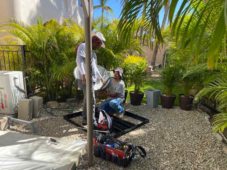We really didn’t think that we had a satellite option because we are on the first floor and can’t mount a dish higher on the building. I should have known that LaMoyne from Los Cabos Satellite Services would find a way – he provided us support for our satellite television in Zacatitos. He agreed to come right over and see if we had a way to get Shaw once again. He and Miguel came and tested signal and found that they could put a dish on the ground and get strong signal. Also, he said that he had a special metal stand so that he would not have to mount the dish anywhere and it could just be taken when we move to our new townhouse when it is ready. He also said that he could lease us the box so that we wouldn’t have to set up our own account at this temporary location