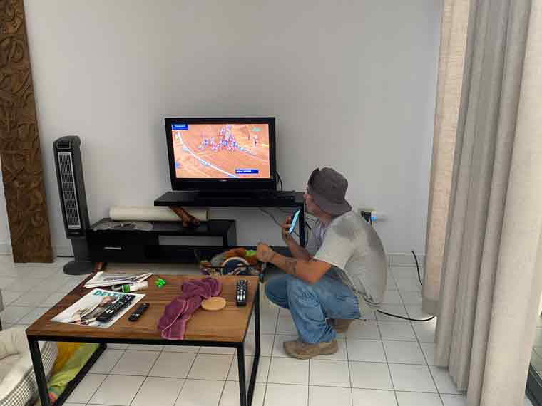 The assessment was Saturday and Miguel and Abraham arrived Tuesday morning to install the system. They were very efficient, orderly and took care with the installation. Knowing that this was temporary, the only drilling was one very small hole near the TV to pull the cable from the satellite dish to the box. In less than two hours, we were once again completely set up with satellite TV. And, as they say, “a happy wife, a happy life.”