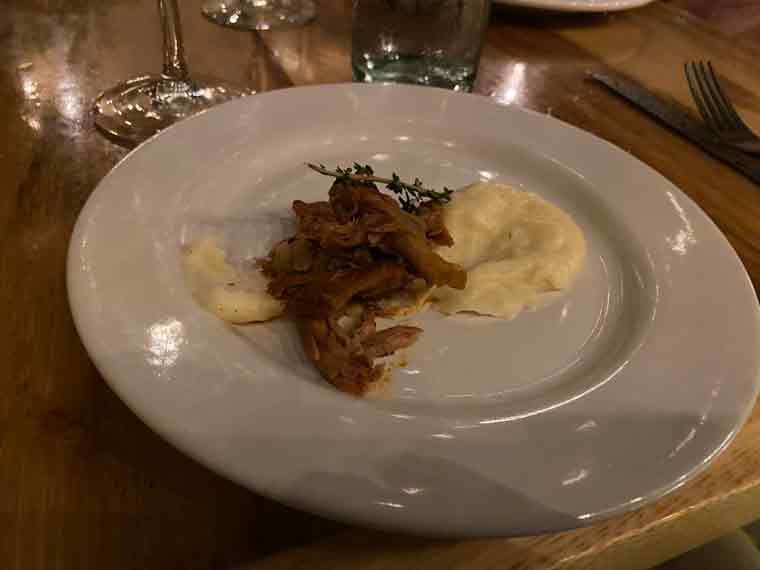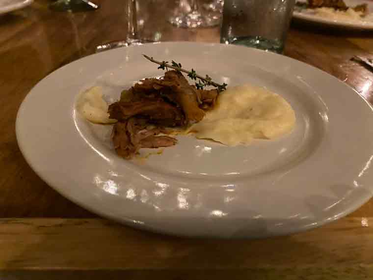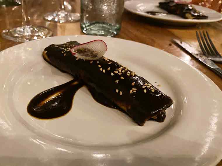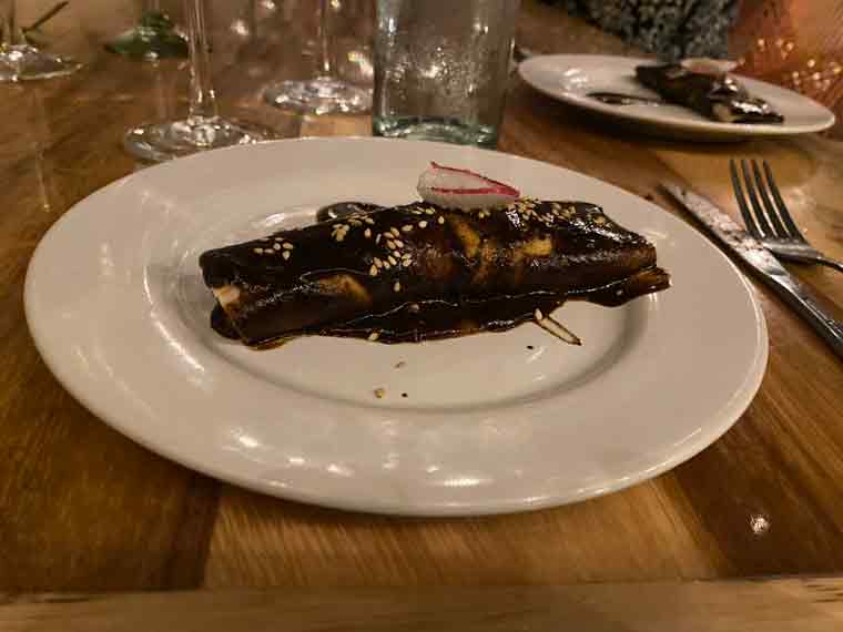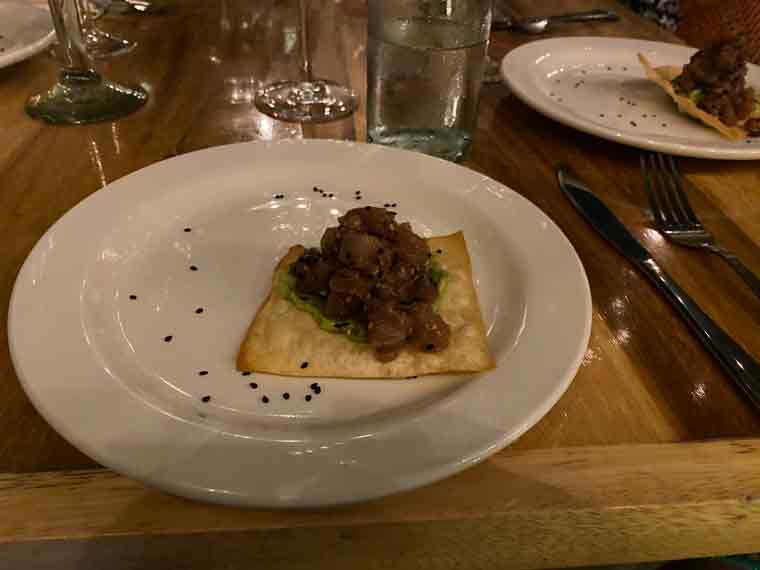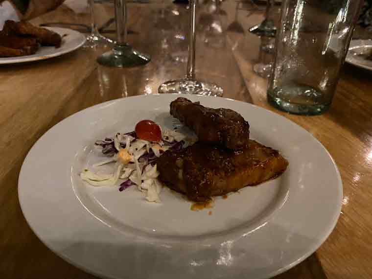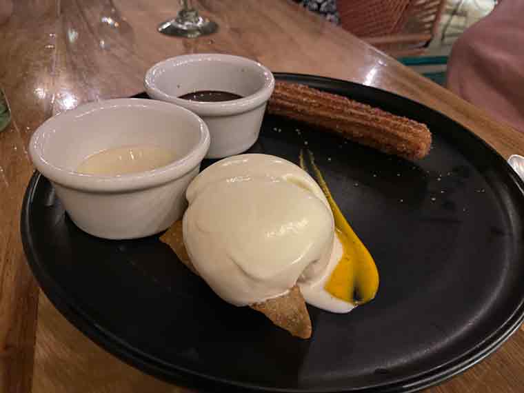 Santiago Lopez worked with the chef at Kauil to match their wines with the four courses of the dinner. The first course was Asian Tuna Tartar paired with 2021 Rose Mourvedre. The second course was Tamarindo pork ribs paired with 2019 Mourvedre. The third course Lamb in Adobo sauce over mashed potatoes paired with 2015 Noble Cru. The fourth course was a Chicken enchilada smothered in their famous mole sauce paired ith 2019 Petite Verdot. We also enjoyed a churro with vanilla ice cream for dessert.