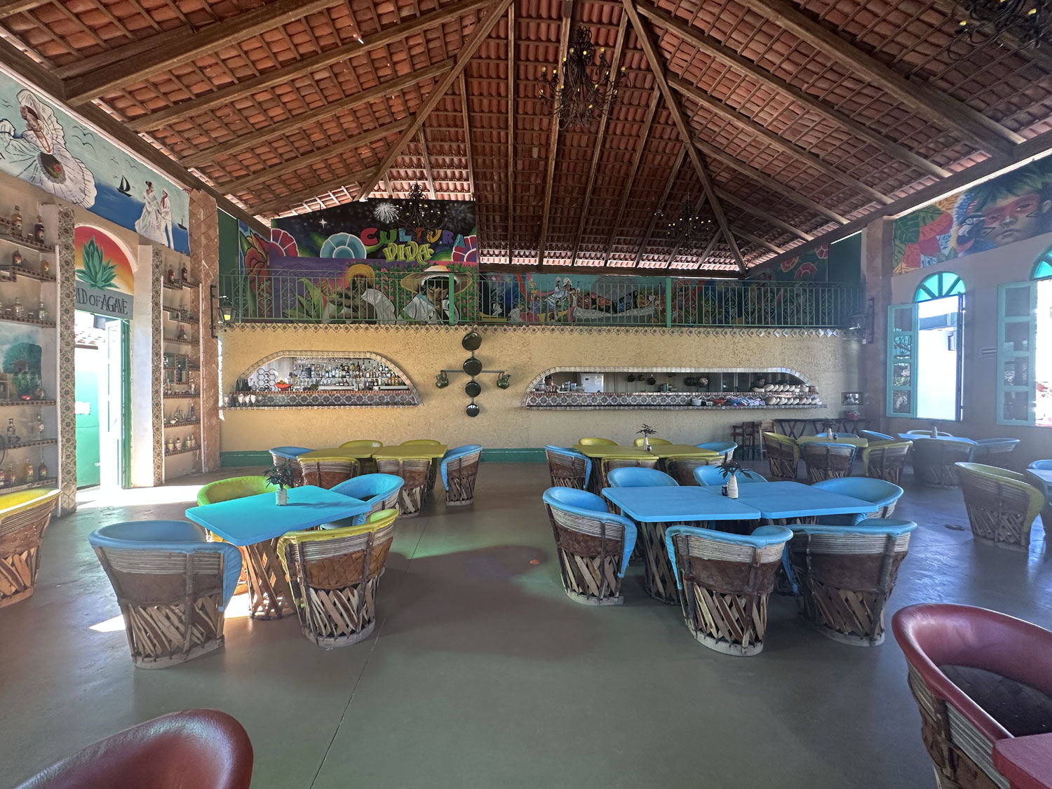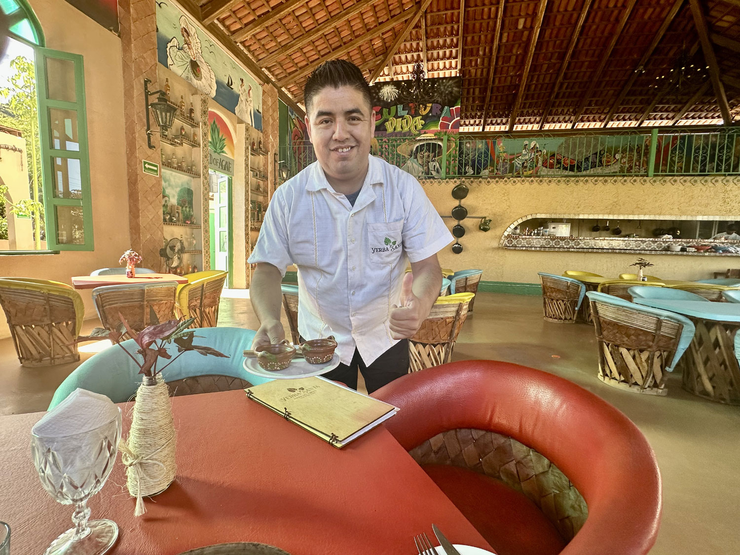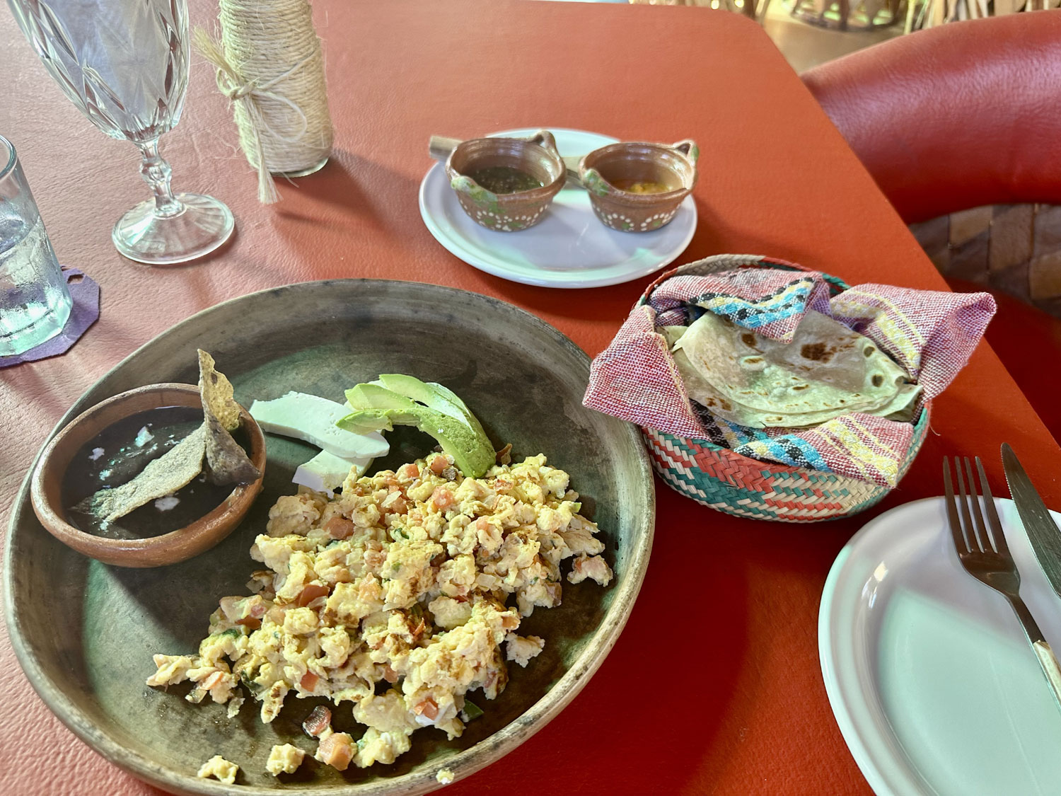 Located on the corner of Miguel Herrera and Calle Libertad is a stylish Mexican restaurant – Yerba Santa (Holy Herb). The entrance is a large arched gate leading into a big courtyard with a bar and seating at the back. The main dining room is inside a building on the property, which has murals all around the top of its high walls leading up to a tiled-palapa style roof. The murals show great scenes of Mexican life. I was having a late breakfast and grabbed an equipale chair at a table in the dining room. My server, offered me a menu in Spanish and said that the QR code in the bottom right corner led to an English menu on line. It was late enough that he also gave me the lunch and dinner menu.