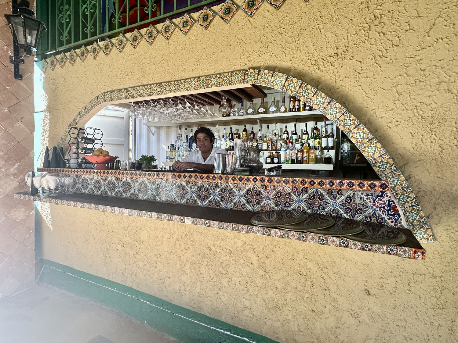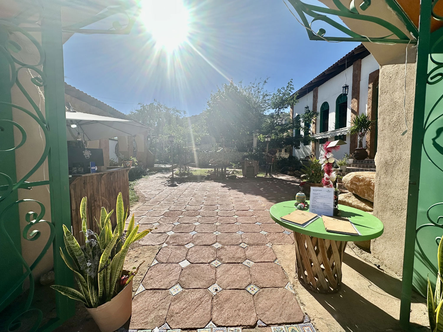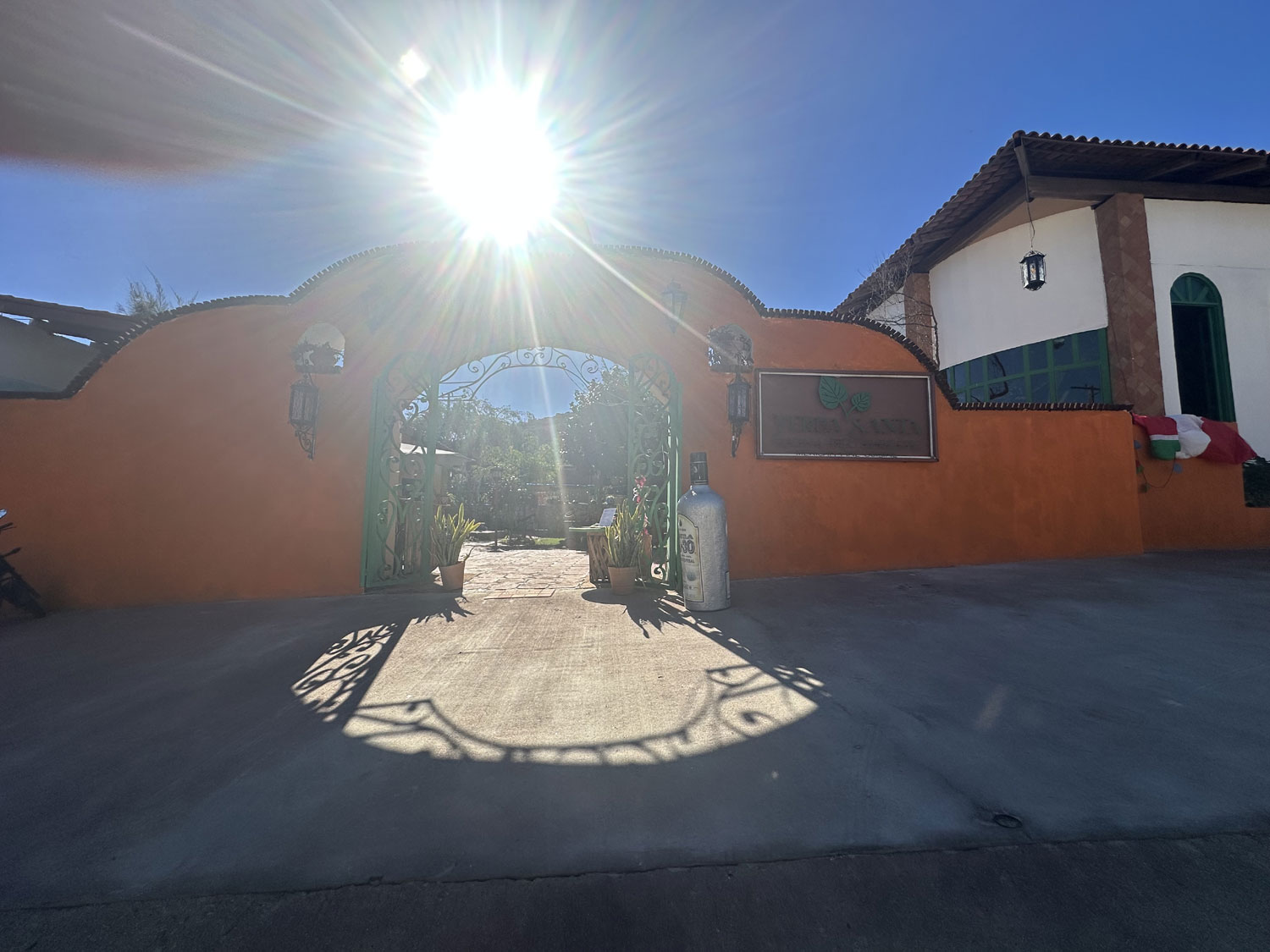 Located on the corner of Miguel Herrera and Calle Libertad is a stylish Mexican restaurant – Yerba Santa (Holy Herb). The entrance is a large arched gate leading into a big courtyard with a bar and seating at the back. The main dining room is inside a building on the property, which has murals all around the top of its high walls leading up to a tiled-palapa style roof. The murals show great scenes of Mexican life. I was having a late breakfast and grabbed an equipale chair at a table in the dining room. My server, offered me a menu in Spanish and said that the QR code in the bottom right corner led to an English menu on line. It was late enough that he also gave me the lunch and dinner menu.