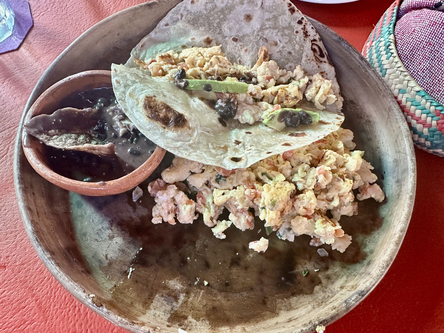 The breakfast menu offered omelets, empanadas, quesadillas, chilaquiles, French toast, pancakes, fruit, eggs as you like them as well as enchiladas, tacos and several dishes were served with mole. I decided to have my standard breakfast of Huevos a la Mexicana – scrambled eggs with Pico de Gallo. The order came with slices of avocado, cheese, refried beans and flour tortillas. The tortillas meant that I had to make myself some breakfast tacos. The food was very good as was the service.