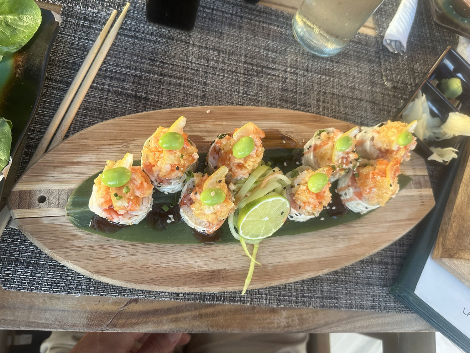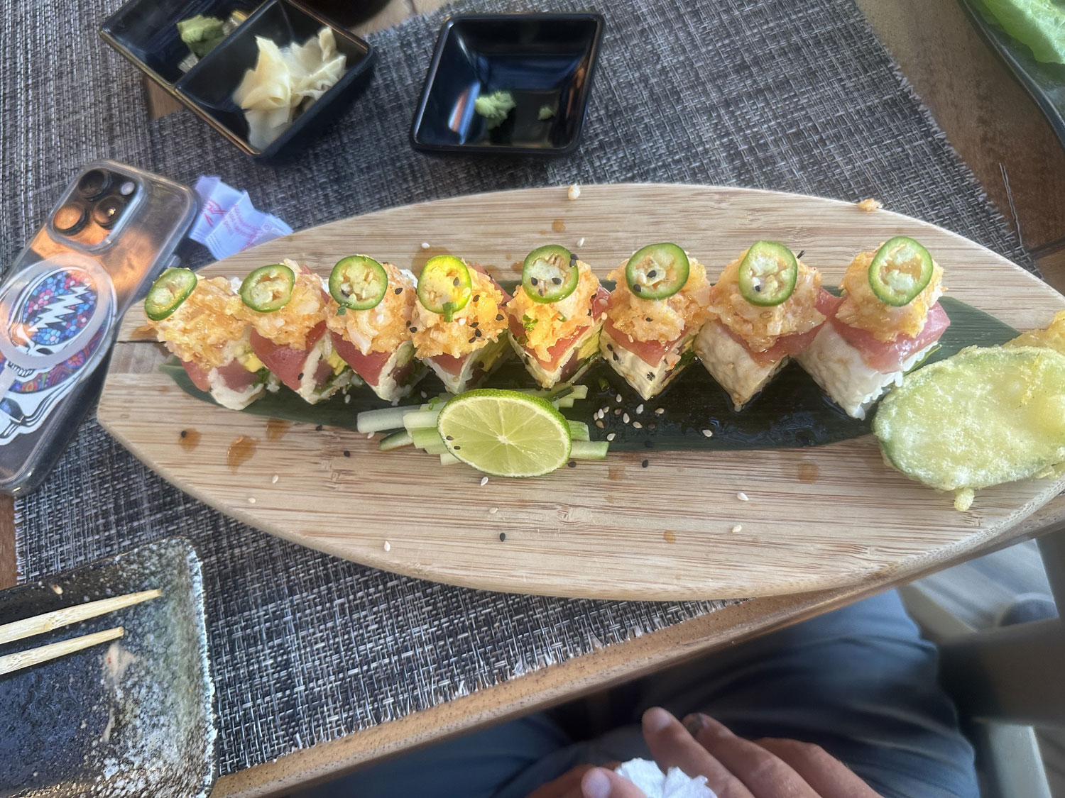 The restaurant is decorated with surfboards and murals and has two different dining areas. There is a small bar to the right as you enter Zai Sushi. The menu is extensive – seven pages with a separate cocktail menu – offering appetizers, ceviche, special Zai dishes, classic rolls, special rolls, hand rolls, and two pages of gourmet rolls. The last page is for drinks. For appetizers, we selected gyoza and tempura vegetables. The fried gyoza came with two different dipping sauces – one sweet and the other spicy. The tempura dish included three different vegetables – zucchini, carrots, and potato – and also had two different dipping sauces. For main courses, Beth selected the Tempura Shrimp with tempura vegetables; I ordered the Lemon Cream Salmon; and Patrice and Ethan each chose a sushi roll. The Lemon Cream Salmon was served with broccoli and the lemon cream sauce was delicious. The Tempura Shrimp was served in a large pile with two dipping sauces, and each of the rolls had eight rolls. Silence descended on the table as everyone dug into their food.